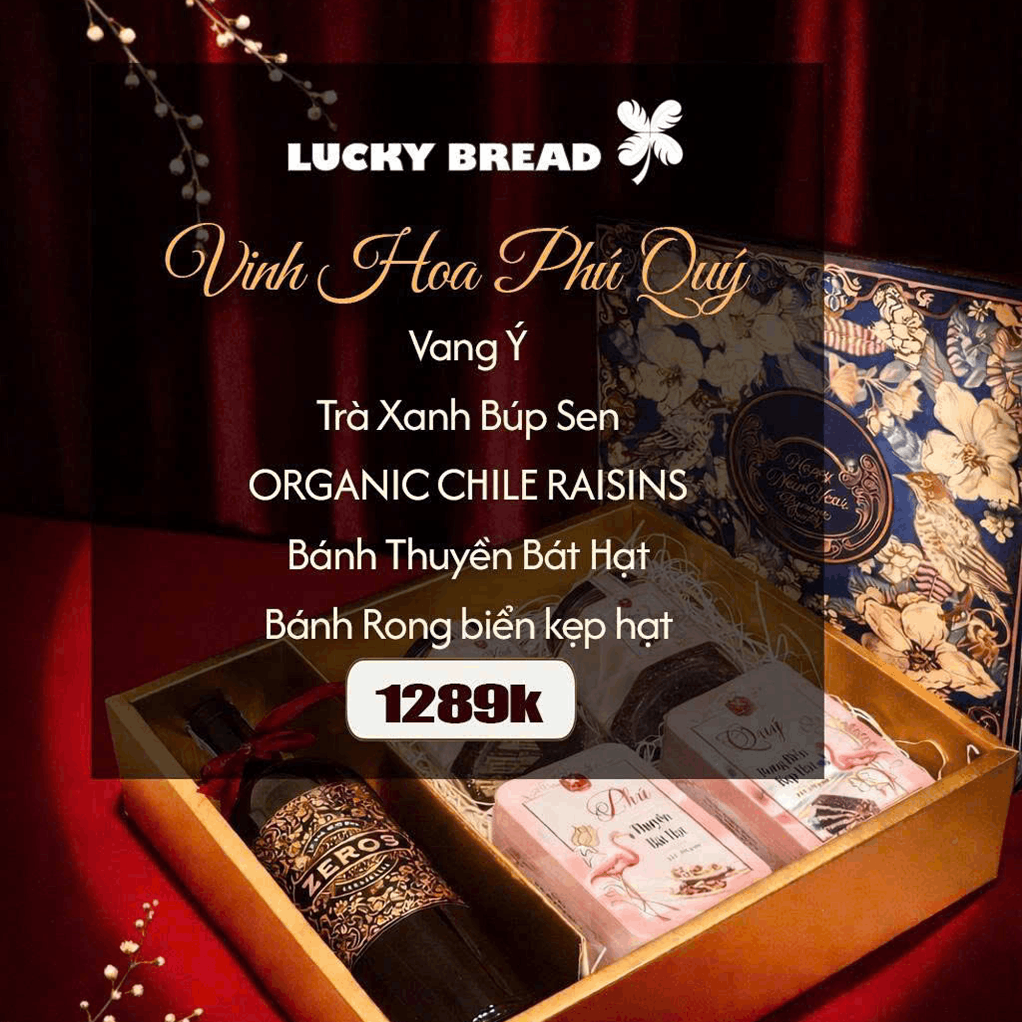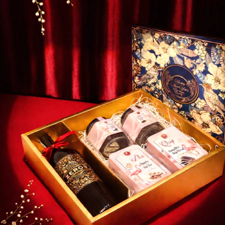 Hộp Quà Tết Vinh Hoa Phú Quý là set quà Tết tinh tế, kết hợp hài hòa giữa vang Ý, trà xanh búp sen và các dòng bánh – hạt chọn lọc, mang ý nghĩa vinh hoa – phú quý – an khang cho năm mới. Phù hợp làm quà biếu gia đình, người lớn, đối tác và khách hàng dịp Tết.