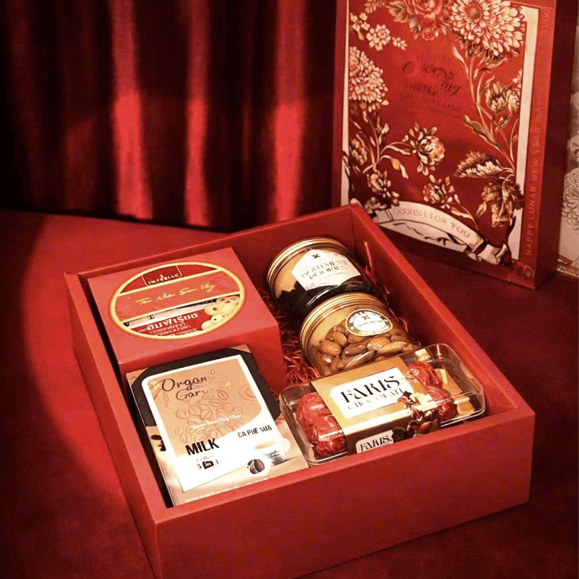 Hộp Quà Tết Vượng Phát là set quà Tết cao cấp kết hợp bánh, cà phê và hạt nhập khẩu, mang ý nghĩa vượng khí – phát tài – sung túc trong năm mới. Phù hợp làm quà biếu gia đình, người thân, đối tác và khách hàng.